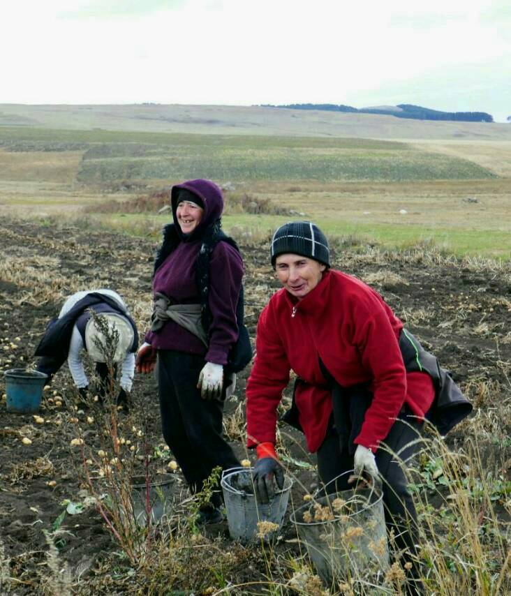 Auf dem Kartoffelacker im Südwesten Georgiens, Samtskhe-Javakheti Hochplateau. Die Ernte fällt dieses Jahr vergleichsweise mager aus, ein Insekt hat 2/3 der kostbaren Erdäpfel beschädigt.