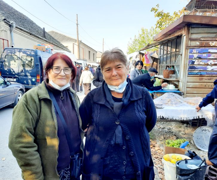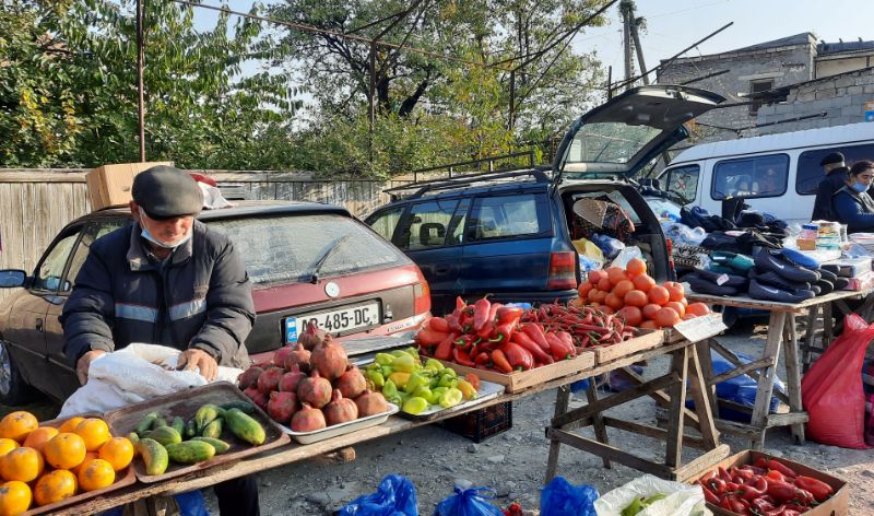 Auf dem Dorfmarkt in Garikula, Zentralgeorgien, werden die letzten unter freiem Himmel gereiften Tomaten, Gurken und Peperoni angeboten. Die ersten Granatäpfel sind in der Auslage, jedoch von Aserbaidschan, die einheimischen werden erst im Dezember reif sein. Tamara und Eka, die zwei Marktfrauen, haben hier auf dem Land grössere Mengen eingekauft und werden anschliessend straks nach Tiflis fahren, um die qualitativ hochwertige Ware dort wiederzuverkaufen.
